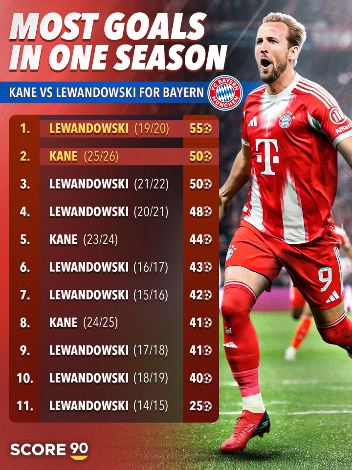 本赛季凯恩代表拜仁出战42场比赛,已经贡献50粒进球和6次助攻,距离莱万在拜仁的最佳赛季2019/20赛季创下的47场55球还有5球。