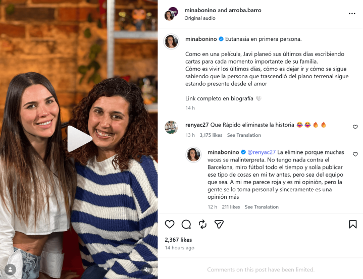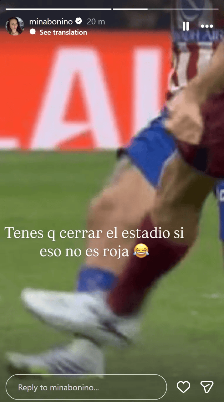在她随后发布的宣传个人节目《人民的米娜》的相关贴文中,有球迷留言质疑:“你删动态删得也太快了吧”。对此,米娜回应称:“我删掉是因为很多时候会被误解。我对巴塞罗那没有任何意见,我一直都有看足球,以前也经常在推特发这种内容,不管是哪个球队。我觉得那是红牌,这只是我的看法,但很多人会把它当成针对个人,说实话这也只是众多意见中的一个而已。”